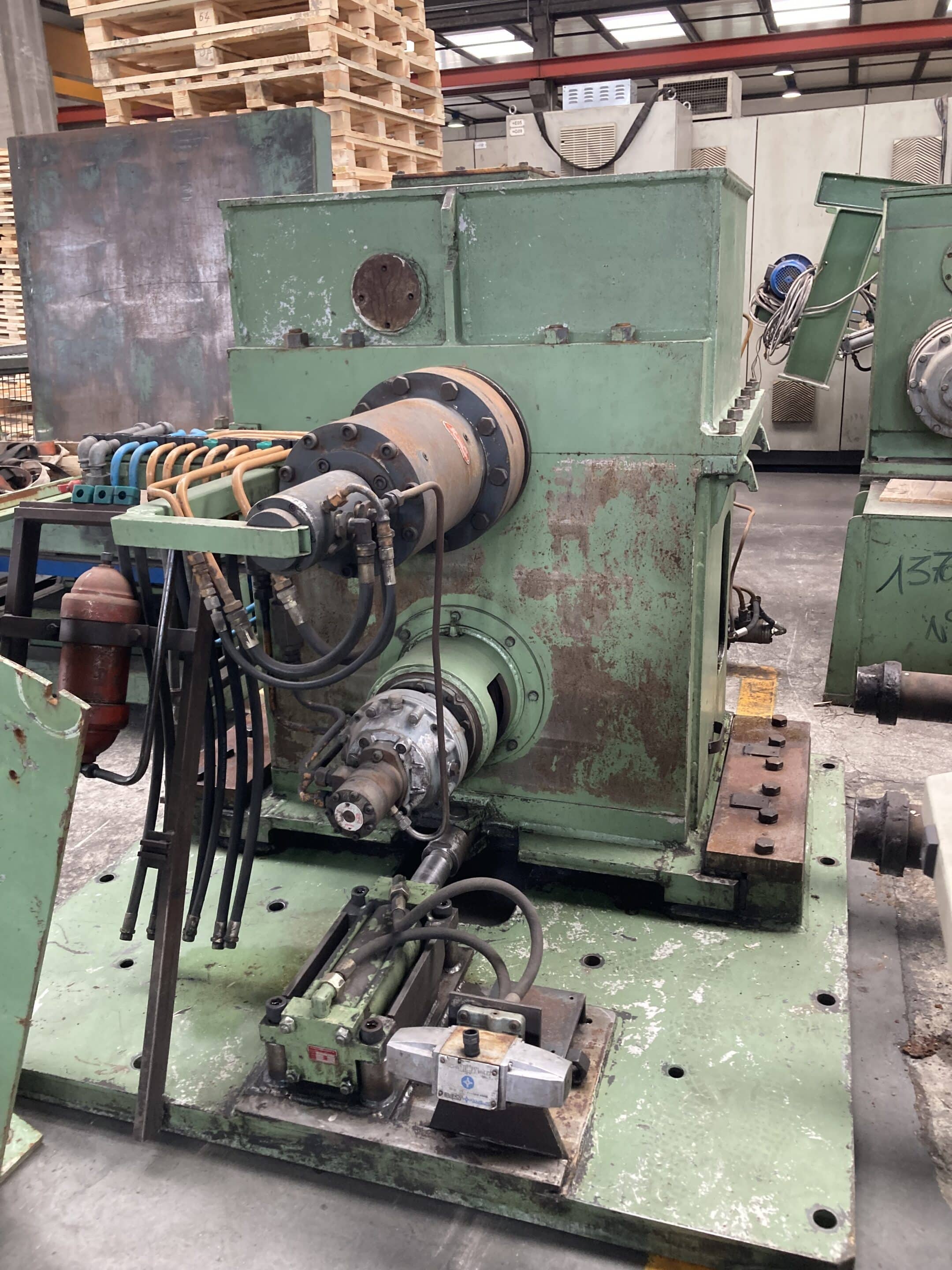 Espansione oleodinamica Diam. mandrino: 480-525 mm. Tavola mandrino: 830 mm Portata: 8.000 kg Motorizzato Basamento con guide, traslazione oleodinamica (corsa = +-150 mm) Braccio di pressione motorizzato, opzionale. Condizioni:da revisionare